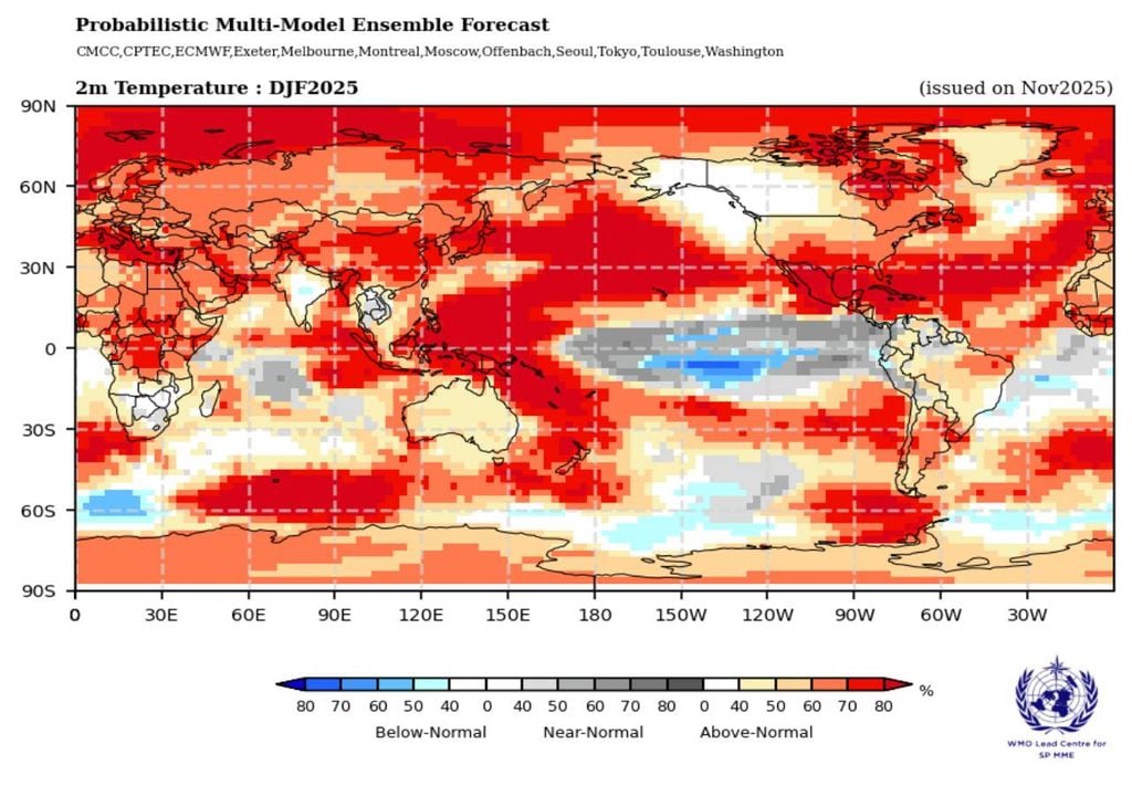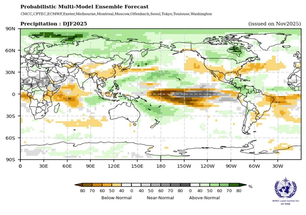 A Organização Meteorológica Mundial, OMM, divulga todos os meses uma previsão sazonal a nível global para os próximos três meses, tendo sido a última para o chamado inverno meteorológico, período de dezembro de 2025 a fevereiro de 2026.