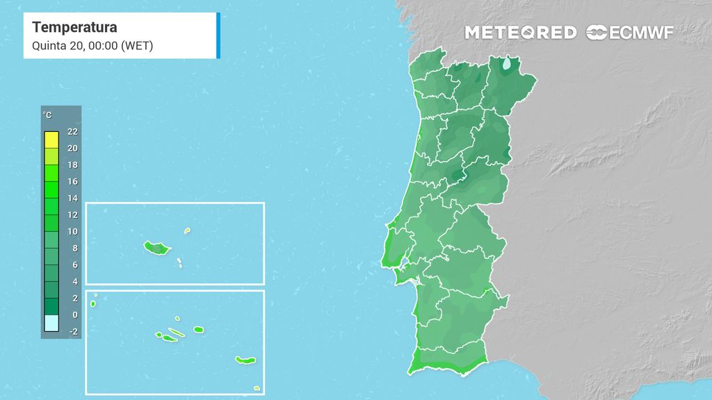 Sexta-feira (21) deverá ser o dia mais frio da semana, com a massa de ar polar marítimo a fazer-se sentir em pleno. Nos pontos mais elevados da Serra da Estrela, como em Penhas da Saúde, prevê-se uma mínima próxima de −5 °C, esta será a localidade mais fria do país durante a madrugada de dia 21 de novembro.