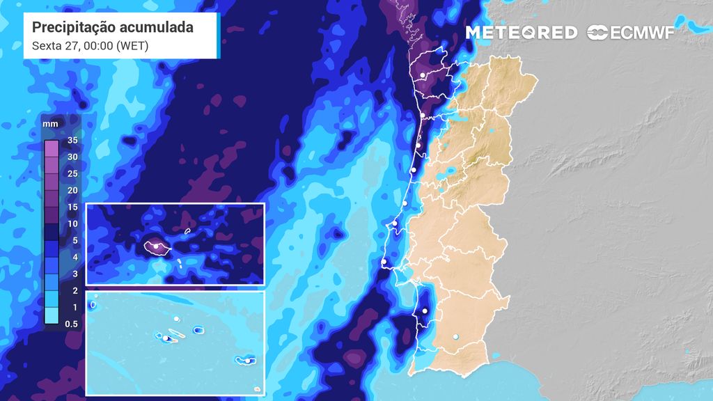 Esta é a previsão da distribuição de chuva acumulada em Portugal continental até sexta-feira (27) à noite, após a passagem de duas frentes atlânticas de fraca atividade e com reduzido grau de organização.