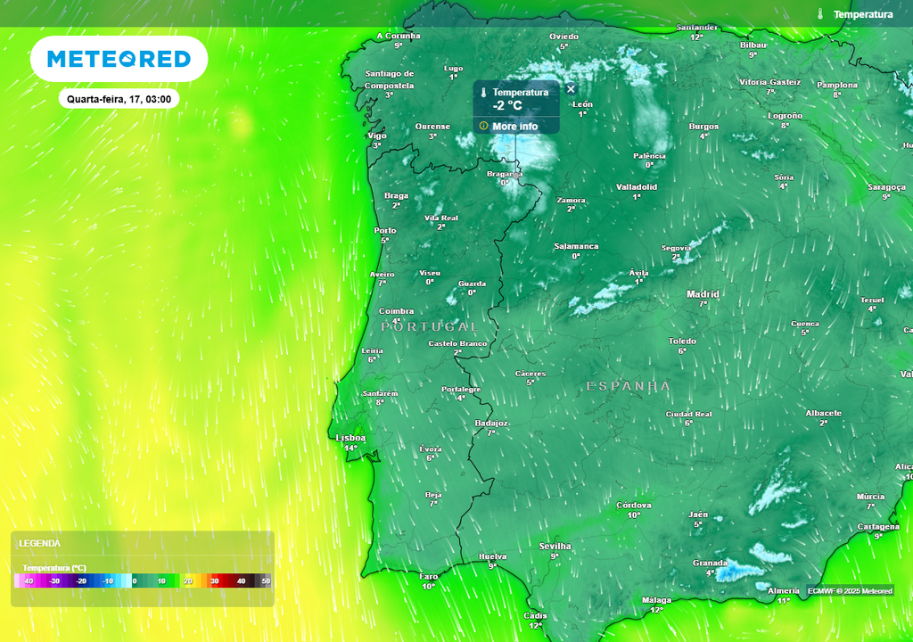 Para quarta-feira (17) antecipa-se um estado do tempo anticiclónico (embora tornando-se gradualmente mais nublado), com possível formação de nevoeiro matinal nalguns locais e temperaturas ainda mais baixas do que no dia anterior. As temperaturas mínimas serão iguais ou inferiores a 0 ºC nos distritos de Bragança, Guarda e Castelo Branco. As máximas oscilarão entre 13 e 16 ºC em grande parte do país, exceto no interior Norte e Alto Alentejo onde se situarão entre 8 e 12 ºC.
