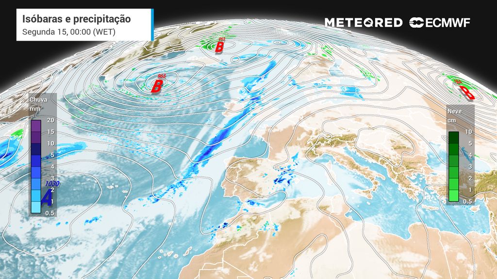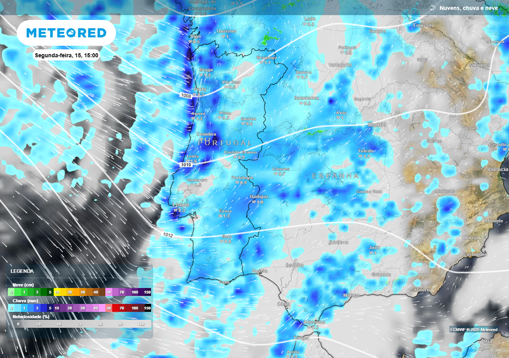 No entanto, a estabilidade atmosférica não irá durar muito em Portugal continental. A partir do meio da manhã da próxima segunda-feira, 15 de dezembro, o modelo Europeu antecipa a chegada e passagem de uma nova frente que distribuirá chuva de noroeste para sudeste da nossa geografia.