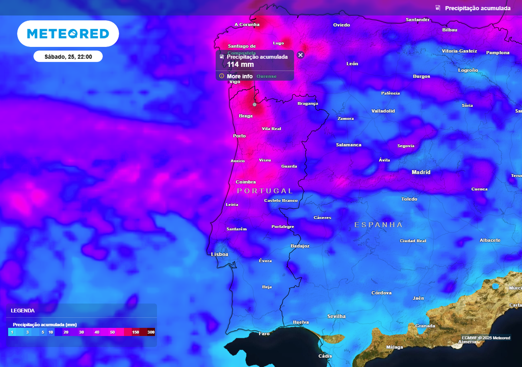 Com esta situação sinóptica, as acumulações serão bastante significativas no Minho, especialmente nas zonas montanhosas dos distritos de Viana do Castelo e de Braga, que são áreas mais expostas a este fluxo húmido subtropical e onde se prevê que ultrapassem os 100 mm. Noutras zonas do Norte e Centro, tais como os distritos do Porto, Aveiro e os setores ocidentais dos distritos de Vila Real e Viseu, espera-se que as acumulações sejam superiores a 50 mm, podendo os pontos de maior altitude registar até 80 mm.