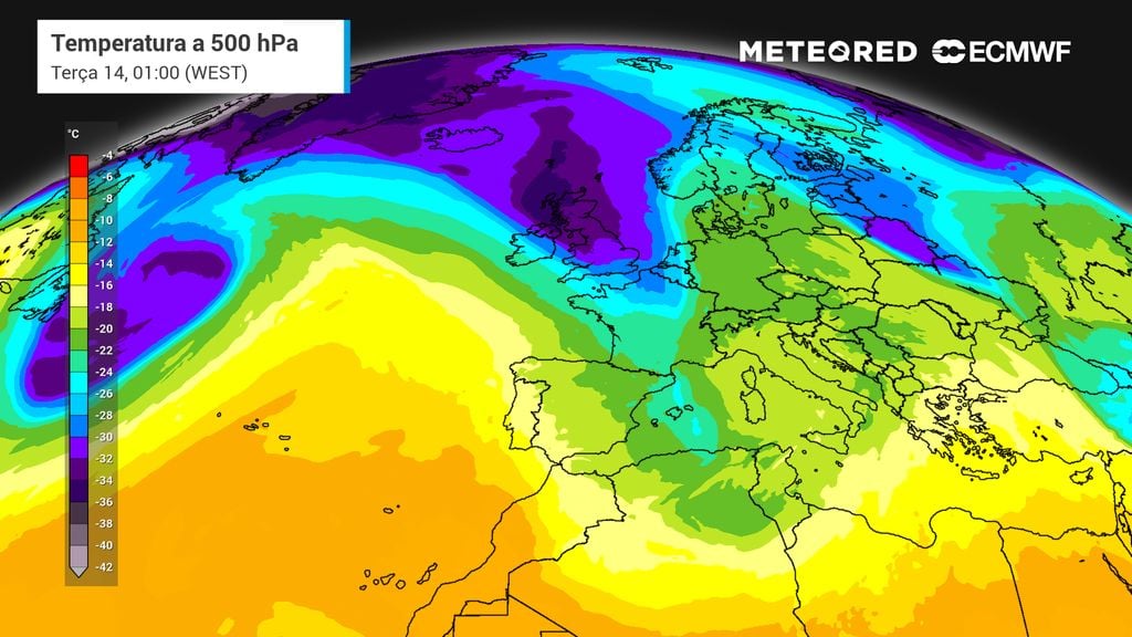 Neste mapa de previsão da temperatura do ar a cerca de 3000 metros de altitude para domingo, 12 de abril, observa-se a presença do ar polar que descerá em latitude até alcançar a Península Ibérica, provocando uma descida acentuada das temperaturas.