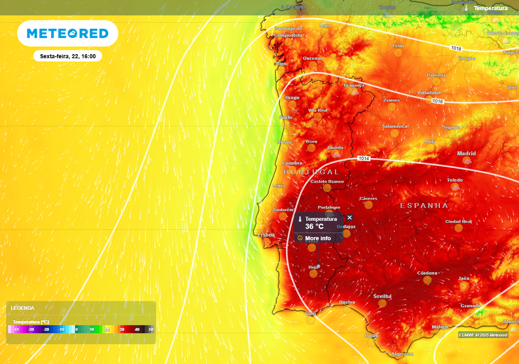 Para a próxima sexta-feira (22), o modelo de referência utilizado pela Meteored aposta na possibilidade de uma subida acentuada das temperaturas máximas em regiões do interior Centro e Sul, com valores de até 36 ºC, em particular nestes 6 distritos: Castelo Branco, Santarém, Setúbal, Portalegre, Évora e Beja.
