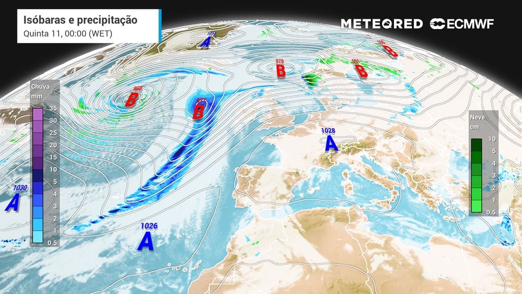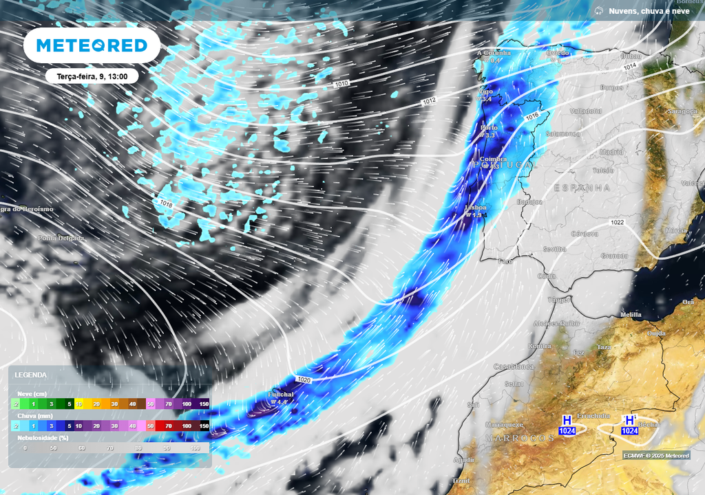 A aproximação de uma depressão atlântica, que se centrará na madrugada de terça-feira (9) a oeste das Ilhas Britânicas, provocará já esta segunda-feira (8) céu muito nublado, que precederá uma frente fria que deixará chuva abundante a partir de amanhã, dia 9, em várias zonas de Portugal continental.