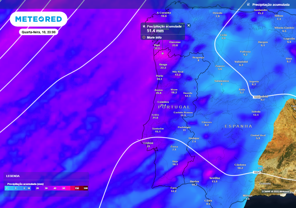 Prevê-se que a chuva seja intensa no território minhoto, podendo acumular cerca de 40 mm só nas primeiras 12 horas de terça-feira (9) nas zonas montanhosas dos distritos de Viana do Castelo e Braga, sendo fraca a moderada neste mesmo período em grande parte do Norte, Centro e Grande Lisboa. À medida que o dia de terça-feira (9) for decorrendo, a chuva espalhar-se-á de noroeste para sudeste, alcançando todas as regiões do Continente.