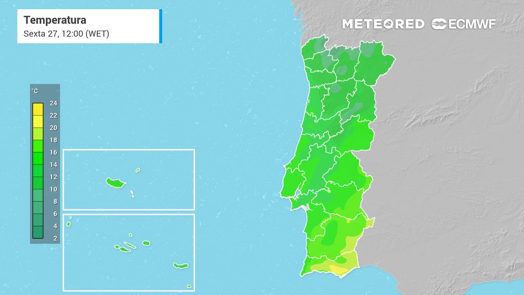 As cidades de Bragança, Vila Real, Viseu, Guarda, Coimbra, Portalegre e Évora deverão ser as cidades a registar essa descida de 7 ºC, sendo esta, possivelmente, a descida mais acentuada, segundo a atual previsão do nosso modelo de confiança, ECMWF. Guarda poderá ser a cidade mais fria do país, com 10 ºC de máxima. Outras cidades como Braga e Leiria poderão registar uma descida de 6 ºC, passando de 19 ºC e 20 ºC para 13 ºC e 14 ºC, respetivamente.