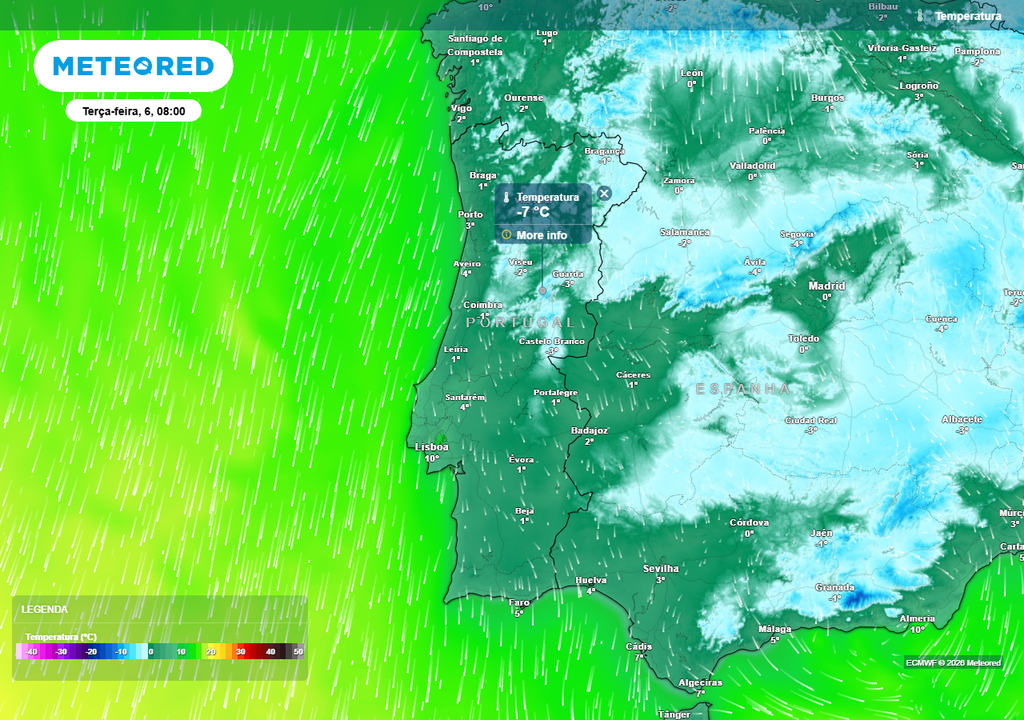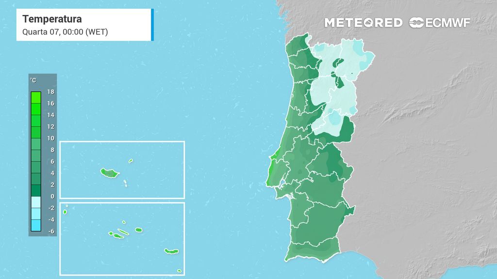 De acordo com os mapas de referência da Meteored, são expectáveis temperaturas inferiores a 0 ºC nestas 6 capitais de distrito: Vila Real (-1 ºC), Bragança (-3 ºC), Viseu (-3 ºC), Guarda (-4 ºC), Coimbra (-1 ºC) e Castelo Branco (-4 ºC). Noutras capitais de distrito, tais como Braga, Portalegre e Évora os termómetros também registarão mínimas bastante baixas, de 0 ºC e 1 ºC.