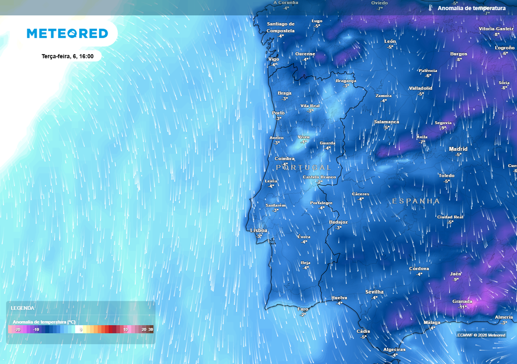 De acordo com os nossos mapas, haverá períodos de chuva fraca até meio da tarde, em geral fracos, podendo ser de neve acima dos 600 metros de altitude no Norte e no Centro, mas com a cota a subir gradualmente para 1000 metros. Até ao final do dia de quarta-feira (7) espera-se que a precipitação acumulada seja extremamente residual (1 a 2 mm), restringindo-se ao Noroeste, ao litoral Centro e Oeste e a alguns pontos do Alto Alentejo.