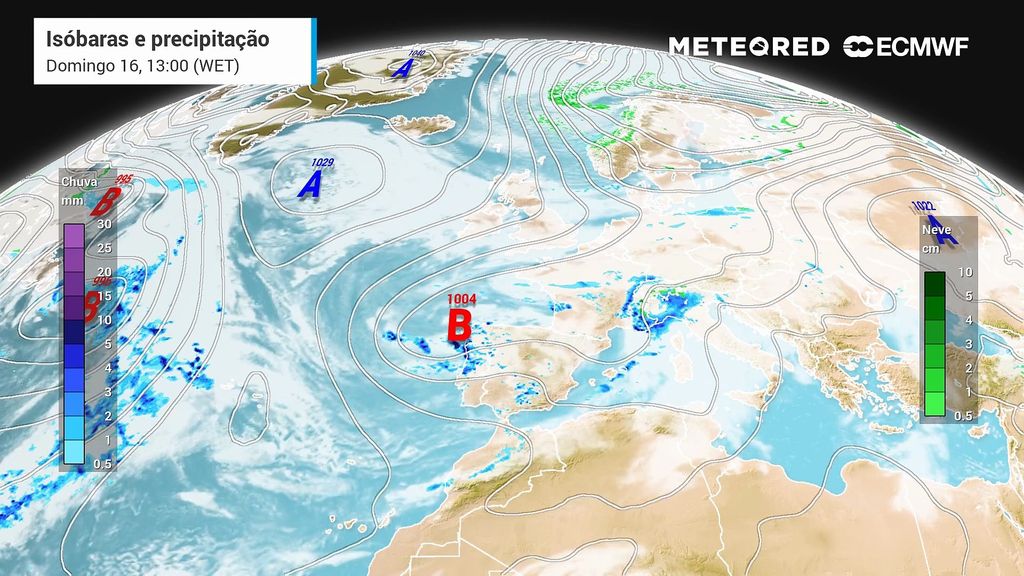 Entre segunda e quarta-feira instala-se uma crista anticiclónica, o fluxo gira para Norte e Nordeste e começa a chegar ar de origem polar, mais seco e frio. O resultado será um início de semana com tempo em geral seco, dias menos nublados, mas noites frias e geadas em grande parte do interior.