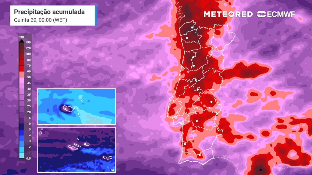 A última atualização do modelo europeu prevê acumulações a rondar os 250-300 mm nas zonas expostas das serras do Minho, Alto Tâmega e Barroso até à meia-noite de domingo (1): estas zonas serão as mais chuvosas de toda a Europa nos próximos dias. Em vastas zonas dos distritos de Viana do Castelo, Braga e Vila Real, as acumulações irão ultrapassar os 150-200 mm, com valores semelhantes ou ligeiramente inferiores previstos para grande parte dos distritos de Porto, Aveiro e Viseu.