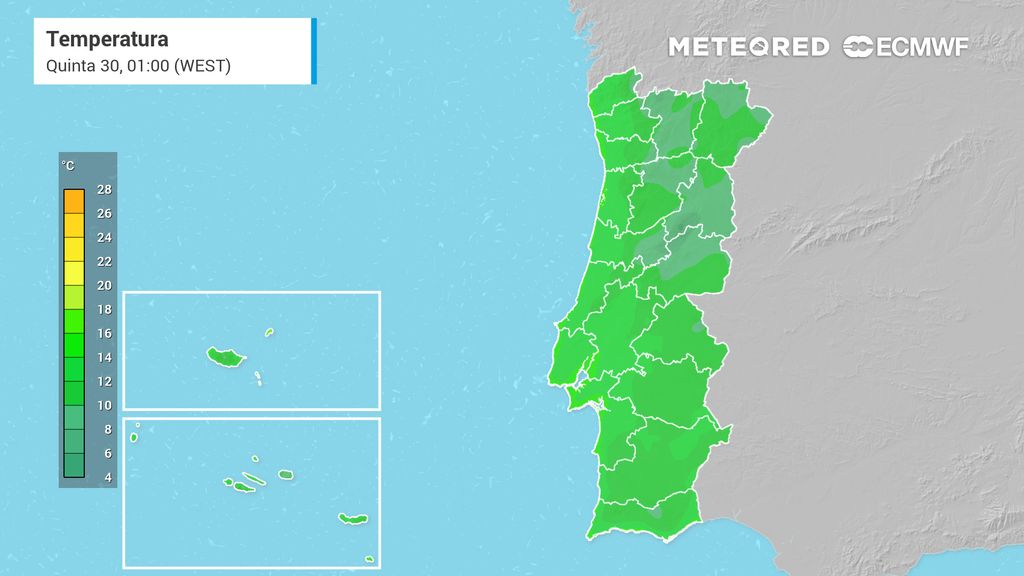 A quarta-feira (29) será o dia mais instável desta sequência. A descida das temperaturas será generalizada, mas particularmente acentuada no Norte e Centro. Distritos como Braga, Vila Real, Porto, Aveiro, Viseu, Guarda e Castelo Branco poderão registar uma queda entre 6 e 7 ºC nas temperaturas máximas face ao dia anterior. No Sul, a descida será mais moderada, entre 1 e 3 ºC.