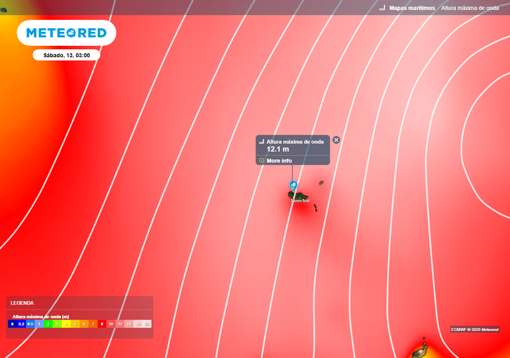 Na costa oeste da Madeira o momento mais crítico da ondulação marítima poderá ocorrer entre o final da tarde de sexta (12) e o meio-dia de sábado (13), com as ondas a poderem atingir uma altura significativa de 5/6 metros e uma altura máxima de 10 metros.