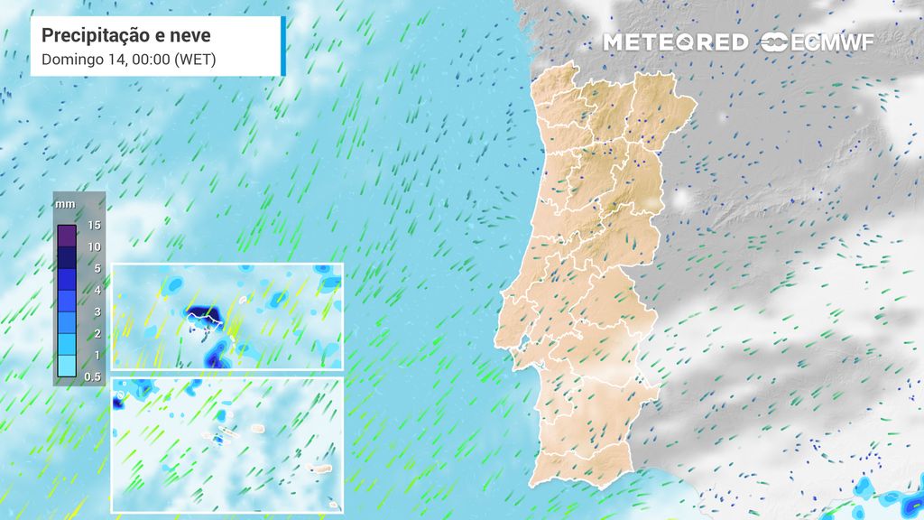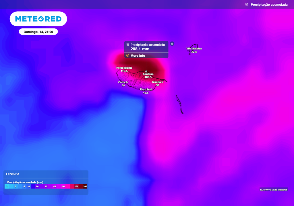 Até às 23:00 de domingo (14) espera-se que as acumulações de chuva mais expressivas ocorram na vertente norte (Porto Moniz, Seixal, São Vicente, Boaventura, São Jorge, Santana, Porto da Cruz), costa oriental (Machico) e regiões montanhosas da ilha da Madeira, ultrapassando os 100 mm e podendo alcançar ou até mesmo superar os 200 mm nalguns destes locais, inclusive em alto mar. Na vertente sul da Madeira e na ilha de Porto Santo, preveem-se acumulações que oscilarão entre 30 e 60 mm.