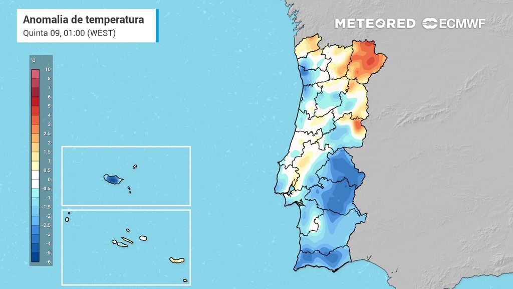 No interior centro e sul, as máximas poderão atingir ou ultrapassar os 30 °C, em particular nos vales do Tejo e do Guadiana. No litoral, esperam-se valores entre 25 °C e 28 °C, com céu limpo e vento fraco. As mínimas manter-se-ão elevadas, próximas de 15 °C a 17 °C em várias regiões, o que proporcionará noites amenas e pouco típicas da estação. O mar manter-se-á relativamente calmo, com ondulação fraca de noroeste inferior a dois metros, e a temperatura da água rondará os 18 °C na costa ocidental e 21 °C no sul. O ambiente será mais semelhante ao de uma semana de final de verão do que ao de pleno outono.
