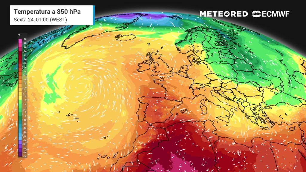 O mapa de anomalia da temperatura mostra a diferença entre os valores previstos e a média climatológica para esta altura do ano. Quando falamos de anomalias positivas, significa que as temperaturas estão acima do normal.
