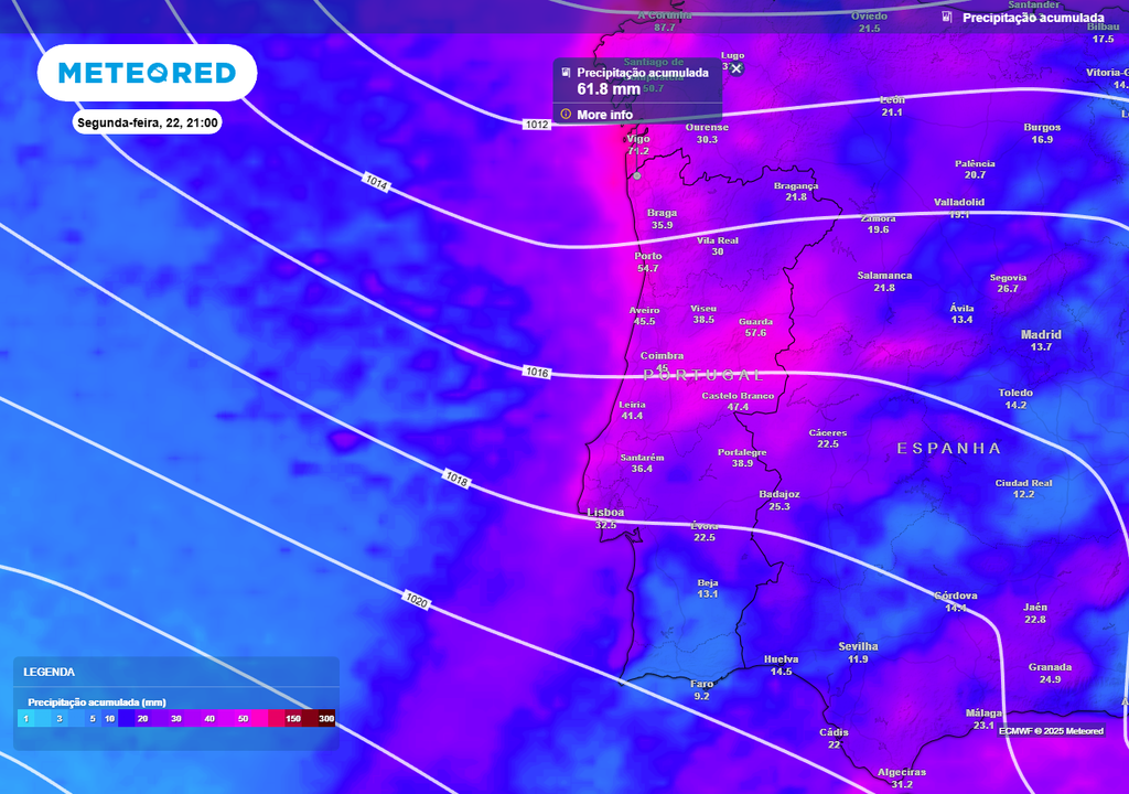 Na segunda-feira (22) prevê-se a entrada em Portugal continental de outra superfície frontal fria, o que resultará em mais um reforço da precipitação, tanto de chuva, como de neve.