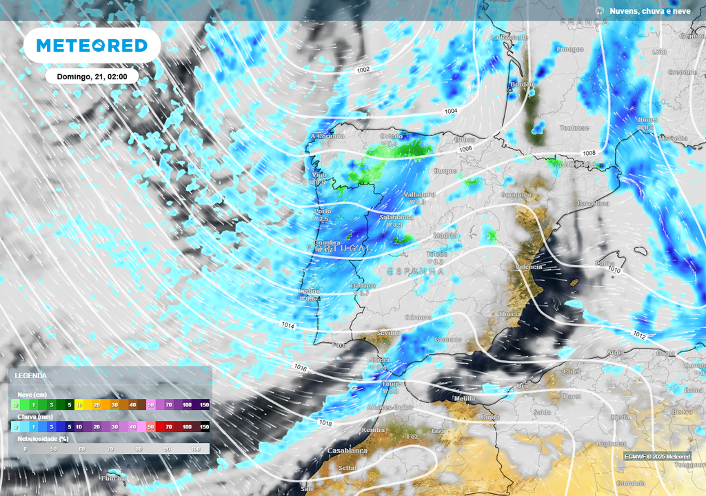 A conjugação do ar muito frio com a precipitação gerada pela investida da segunda frente fria atlântica, que atravessará o nosso território entre o meio da manhã de sábado (20) e boa parte de domingo (21), originará um forte temporal de queda de neve em vastas zonas das Regiões Norte e Centro do Continente.