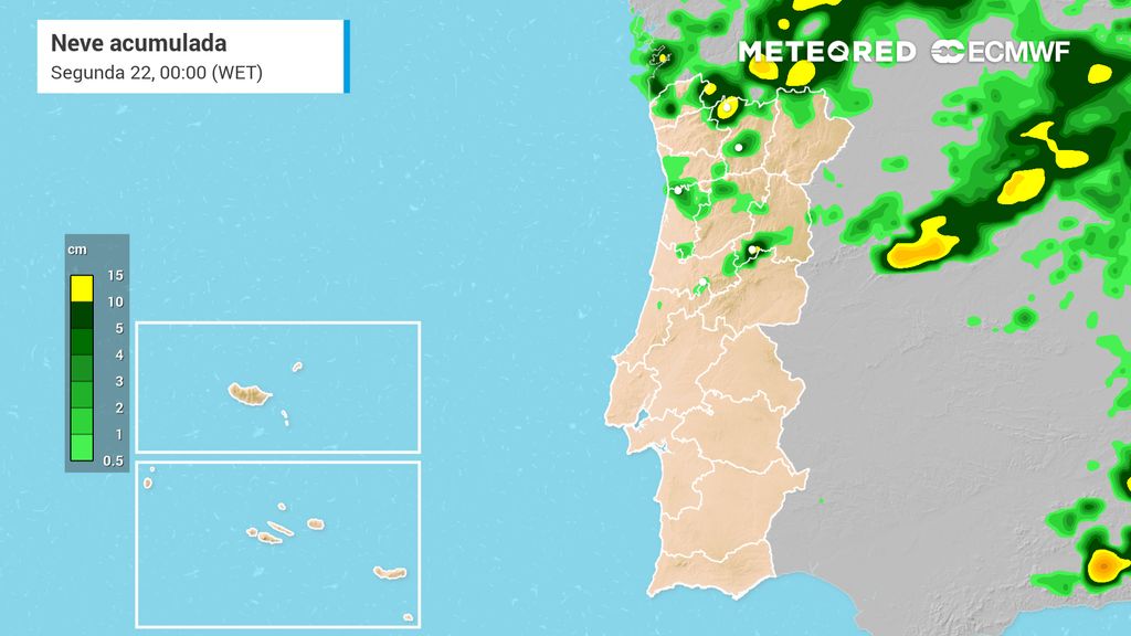 Tampouco se descarta a possibilidade de queda de neve em algumas localidades de maior altitude do interior montanhoso dos distritos do Porto, Aveiro e Coimbra. Nos pontos mais elevados de algumas serras do Norte e do Centro preveem-se 20 a 30 cm de neve acumulada, sendo que localmente este valor poderá ser superado.