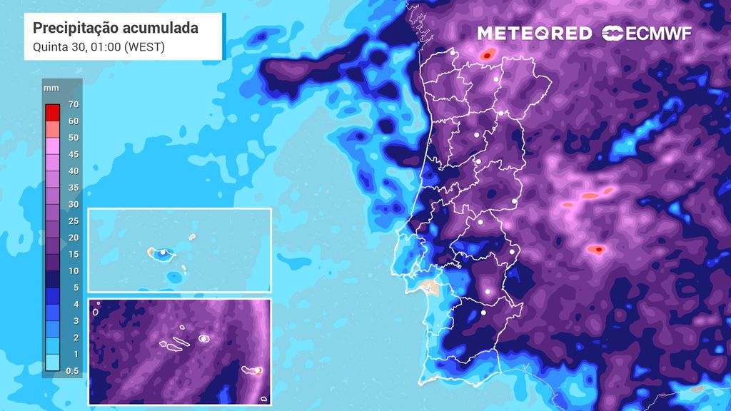 Na quarta-feira, a instabilidade deverá ser mais generalizada. A combinação entre o cavado, o suporte dinâmico em altitude e a energia ainda disponível favorece aguaceiros e trovoadas, por vezes localmente intensos. A precipitação acumulada poderá atingir valores localmente elevados, sendo superior no interior Norte e Centro. As temperaturas descem de forma acentuada, com máximas entre 16 e 22 °C. O vento poderá apresentar rajadas até 60–70 km/h, sobretudo no litoral e nas terras altas.