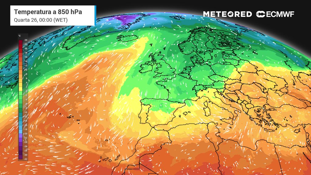 Os nossos mapas mostram uma tendência de descida dos valores de temperatura, pelo menos até ao dia 28, sexta-feira, que poderá ser um dos dias mais frios da semana, especialmente nos distritos do interior Norte e Centro, caso a atual previsão se concretize.