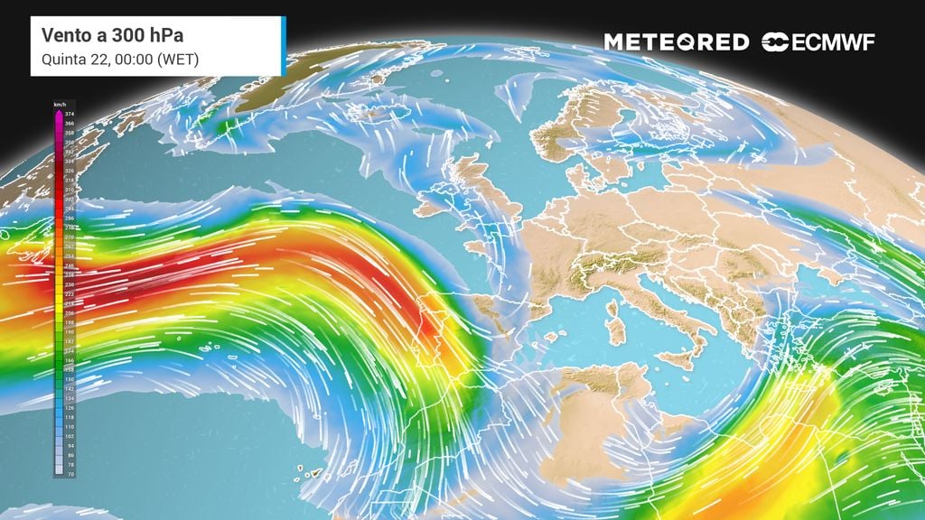 Observa-se a corrente de jato polar. Trata-se de um canal de ventos muito fortes, em forma de tubo. Pode ser entendido como um rio de ar que flui acima das nossas cabeças (a cerca de 9-16 km acima da superfície da Terra) e a velocidades de 100-250 km/h, com milhares de quilómetros de comprimento, mas apenas alguns quilómetros de largura.