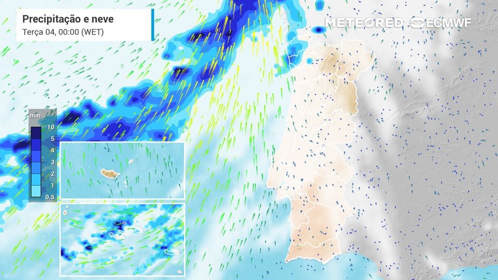 Durante o dia de terça-feira (4), a probabilidade de precipitação deverá concentrar-se apenas no Norte e litoral centro, associada à passagem de uma ondulação frontal ligada a uma depressão secundária que se formará a noroeste da Península Ibérica e avançará em direção às Ilhas Britânicas.