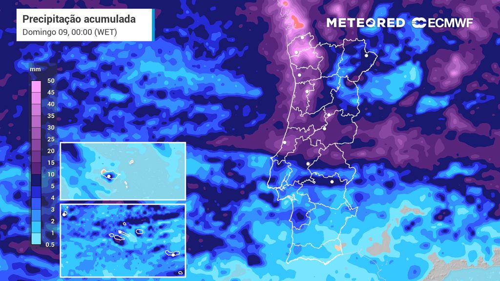 Ainda em relação à chuva, até ao final do dia de sexta-feira, o distrito de Viana do Castelo poderá contar com uma acumulação de precipitação de cerca de 64 mm na zona de Ponte da Barca. O distrito de Braga deverá contar com a segunda maior acumulação, com valores de cerca de 58 mm em Vieira do Minho. Porto e Aveiro poderão vir de seguida com valores na ordem dos 30 mm em vários pontos de ambos os distritos, segundo a mais recente atualização do ECMWF.