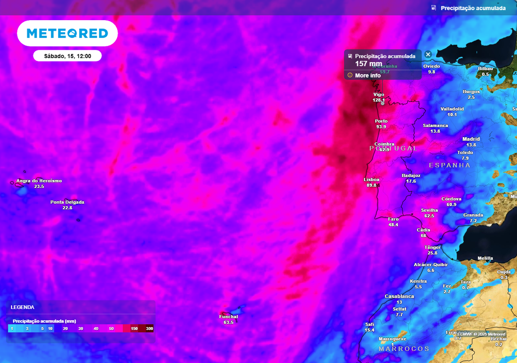 Até sábado (15) poderão acumular-se mais de 150 mm nalguns pontos do Minho, embora se perspetivem geralmente valores entre 100 e 140 mm nesta região. Tal como se pode observar no mapa acima, em várias zonas dos distritos do Porto, Vila Real, Viseu, Aveiro, Leiria, Lisboa, Santarém, Setúbal e até mesmo na zona montanhosa do Algarve preveem-se acumulações entre 90 e 110 mm, podendo pontualmente ultrapassar este patamar.