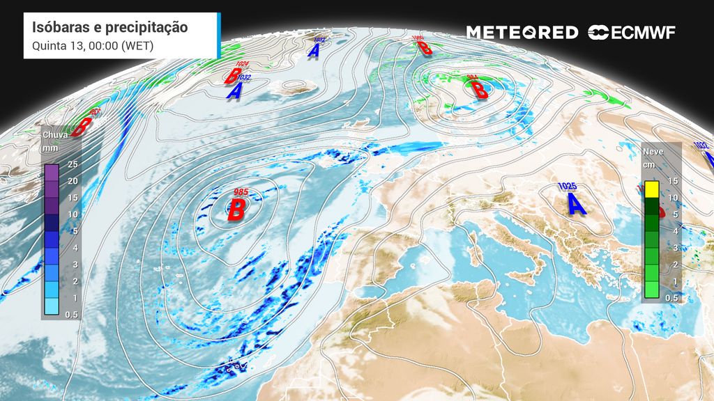 Na quinta-feira (13) o sistema frontal continuará a regar o Minho, Douro Litoral, pontos do interior Norte e Centro e litoral Centro e Oeste na primeira metade do dia, não se excluindo ainda a potencial ocorrência de trovoada. Para a segunda metade do dia, os mapas revelam que a precipitação tenderá a alastrar-se por todo o país, começando pelas zonas habitualmente menos regadas (Algarve, Alentejo e Beiras), reativando-se também no resto do país, onde já antes terá chovido nesse dia.