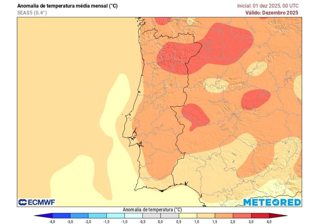Neste momento já não existem dúvidas quanto ao que o modelo europeu prevê para a primeira quinzena de dezembro: as temperaturas estarão acima dos valores médios para a época do ano em toda a nossa geografia. Em Portugal continental as temperaturas poderão ser de 1 a 3 ºC superiores à média para estas datas. Nos arquipélagos dos Açores e da Madeira as anomalias térmicas positivas seriam um pouco mais moderadas (+ 1 ºC), de acordo com os mapas.