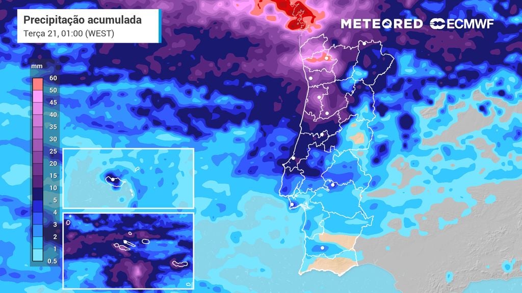 Isto explica o porquê dos mapas mostrarem valores bem mais reduzidos de precipitação acumulada para o mesmo período de tempo: entre 5 e 15 mm em grande parte do país, exceto no Nordeste Transmontano, onde poderão acumular-se até cerca de 35 mm.