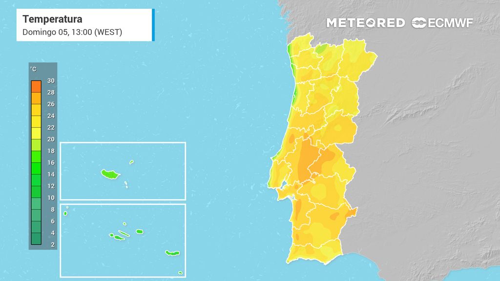Com isto, esperam-se temperaturas máximas entre os 18 ºC em Viana do Castelo e os 28 ºC em Leiria e Coimbra (no litoral) e entre os 23 ºC em Bragança e Guarda e os 26 ºC em Castelo Branco (no interior). Alguns locais poderão registar até 30 ºC, especialmente os inseridos nos vales do Douro e Tejo. À noite e durante a madrugada, os valores deverão oscilar entre os 9 ºC em Bragança e os 16 ºC em Faro.