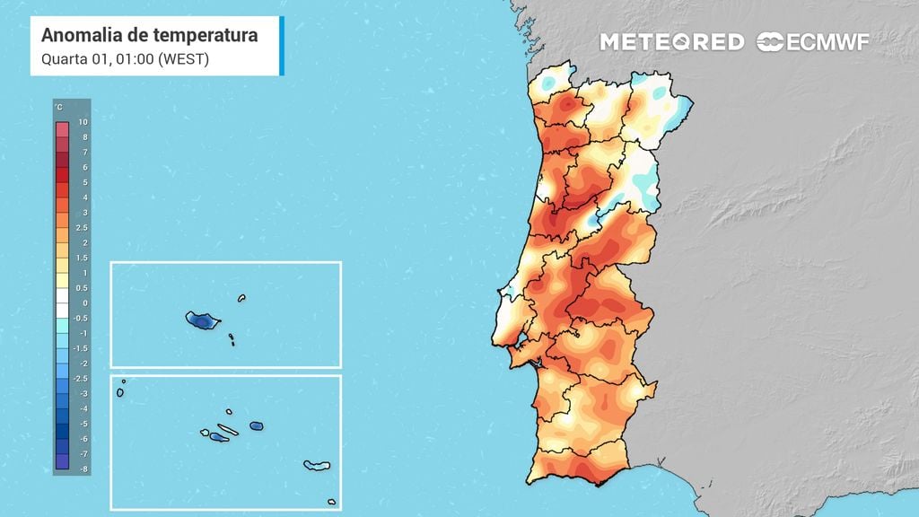 Durante as madrugadas, a combinação de céu limpo, vento fraco e ar seco permitirá uma perda de calor eficiente à superfície, conduzindo a temperaturas relativamente baixas, sobretudo nas regiões do interior Norte e Centro. Em alguns locais mais abrigados, os valores poderão descer para perto dos 4 a 7 °C, proporcionando um início de dia fresco a frio.