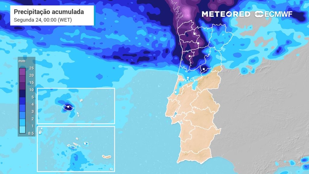 A precipitação será mais frequente no litoral e a oeste da barreira de condensação, com destaque para os distritos de Viana do Castelo, Braga, Porto, Vila Real, Aveiro, Viseu e Coimbra. Nestes locais, podem atingir-se valores acumulados de precipitação até 20 mm ao final do dia, suficientes para inviabilizar muitas atividades ao ar livre.