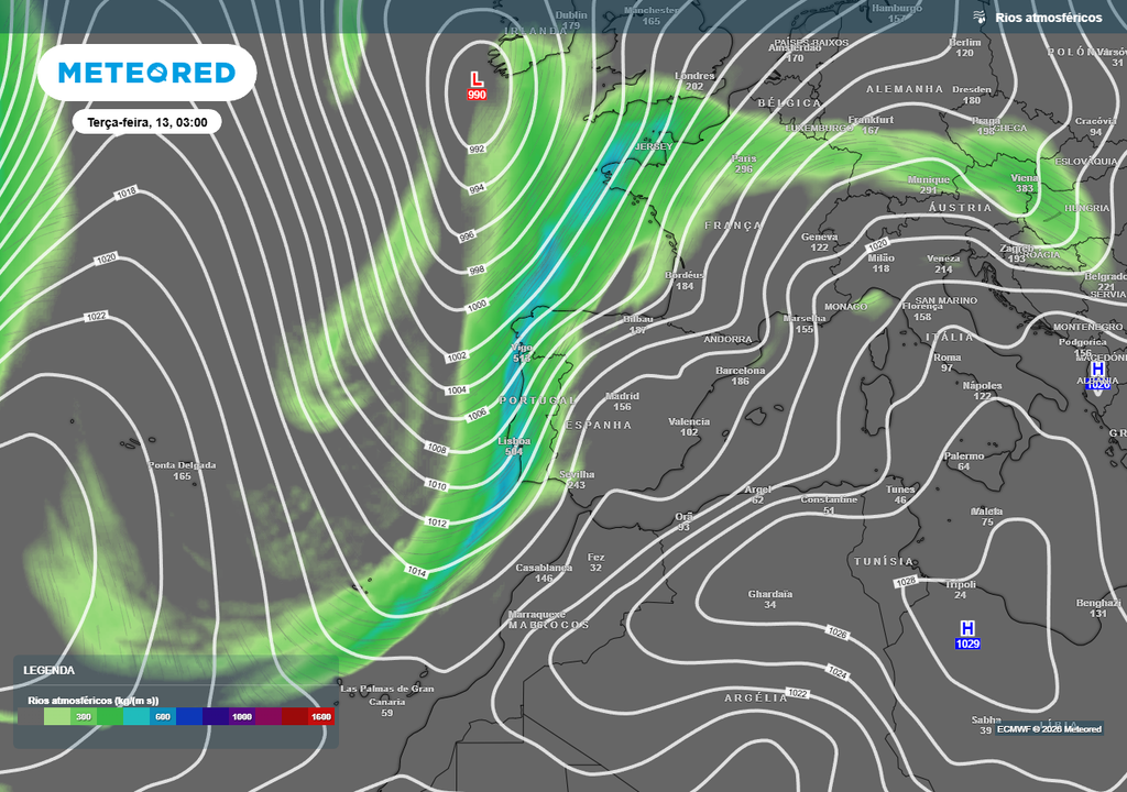 O rio atmosférico, que é uma corrente transportadora de humidade subtropical, irá reforçar a chuva nas vertentes mais expostas do Norte e do Centro. Este panorama resultará numa rega significativa, embora o carácter pluviométrico seja contrastante entre as regiões a norte e a sul do sistema montanhoso Montejunto-Estrela.