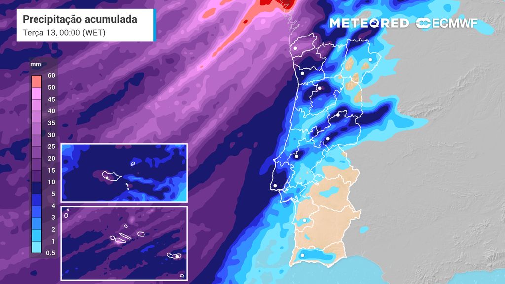 Até ao final do dia de terça-feira (13) grande parte do país terá acumulado entre 20 e 30 mm de chuva. Quanto aos distritos de Viana do Castelo, Braga, Porto, Aveiro, Vila Real, Viseu e na zona correspondente à serra da Estrela espera-se entre 30 e 70 mm devido ao efeito orográfico exercido pela Barreira de Condensação e pela Cordilheira Central (onde se insere a Serra da Estrela).