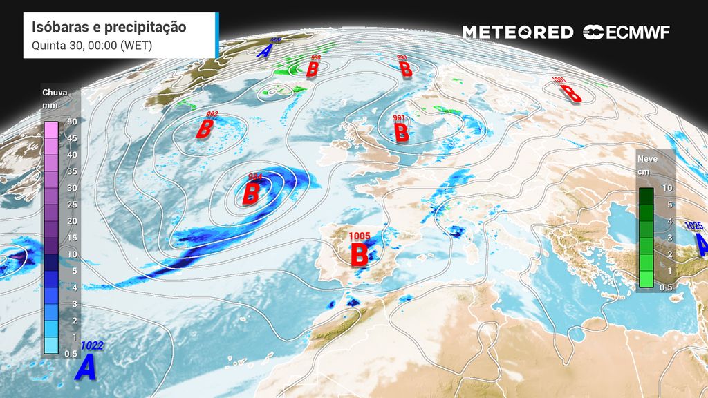 Segundo a mais recente atualização do nosso modelo de confiança, ECMWF, a partir do meio da tarde, poderemos ser afetados por uma frente associada a uma depressão que se irá dirigir para Norte, situando-se a oeste das Ilhas Britânicas.