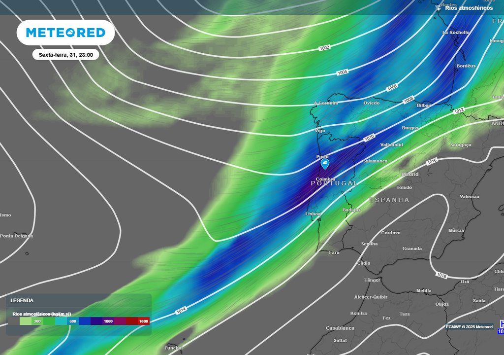 Ainda para a próxima sexta-feira (31) os nossos mapas detetam a presença de um longo rio atmosférico procedente das latitudes subtropicais, carregadíssimo de vapor de água, que seria canalizado pelos ventos de Sudoeste até ao nosso país, reforçando a precipitação gerada pela frente e tornando-a abundante num curto espaço de tempo, sobretudo nas regiões a norte do rio Mondego.