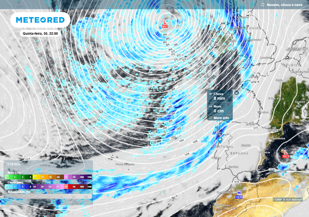 Neste mapa observa-se uma depressão muito cavada situada a oeste das Ilhas Britânicas, a frente fria que lhe está associada a impactar o Minho e a Galiza, e um longo rio de humidade que alimentará a precipitação gerada pela frente.