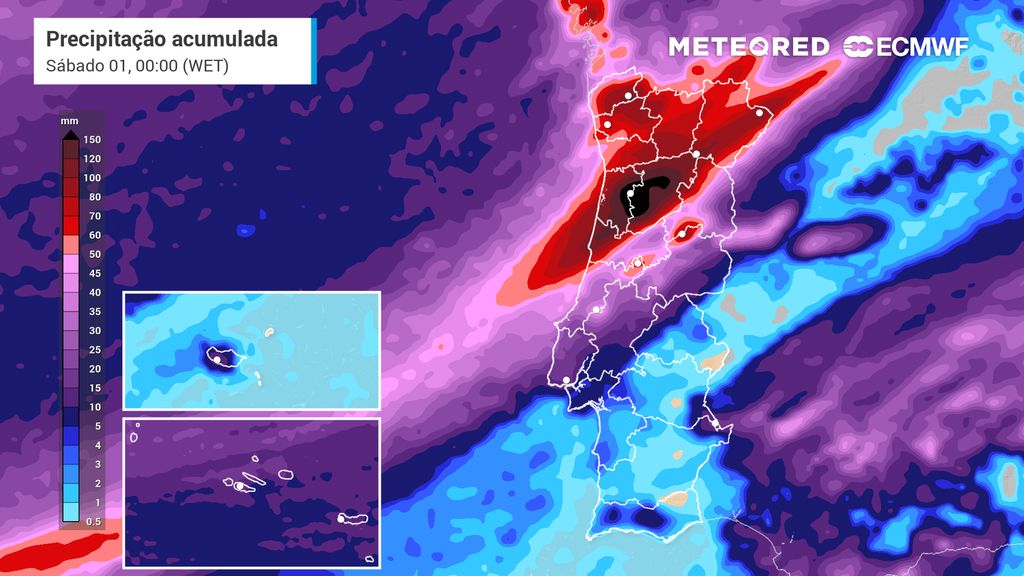 Os mapas da Meteored insistem que haverá duas zonas dentro das regiões situadas a norte do rio Mondego, percetíveis nas manchas a vermelho do mapa de precipitação acumulada, onde a precipitação será especialmente forte e expressiva, podendo gerar inundações repentinas em zonas urbanas, transbordamentos de rios e outros riscos.