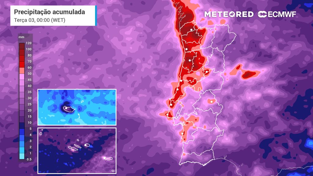 Após a passagem da frente, a chuva pós-frontal persistirá durante o resto de segunda-feira, menos intensa, mas suficiente para reforçar os totais acumulados. Os distritos de Viana do Castelo, Braga, Vila Real, Porto e Aveiro destacam-se como os mais afetados, podendo ultrapassar os 90 mm de chuva em apenas 48 horas, com algumas localidades a aproximarem-se ou mesmo a superar os 100 mm.
