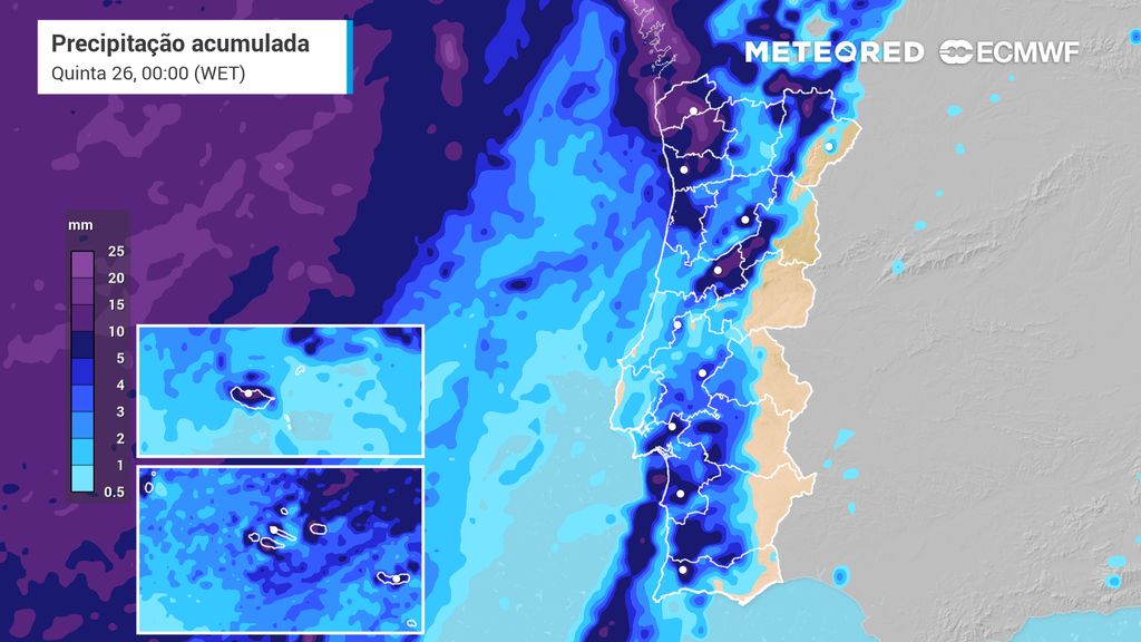 É então a partir da madrugada de quarta-feira (25) que se prevê que comece a chover em Portugal continental, com a precipitação a entrar pelo Noroeste. Na primeira metade do dia a chuva será mais frequente e provável nos distritos a oeste da Barreira de Condensação, podendo surgir de forma residual noutros locais do país. É possível que ocorra queda de neve nos pontos mais elevados da Serra da Estrela.
