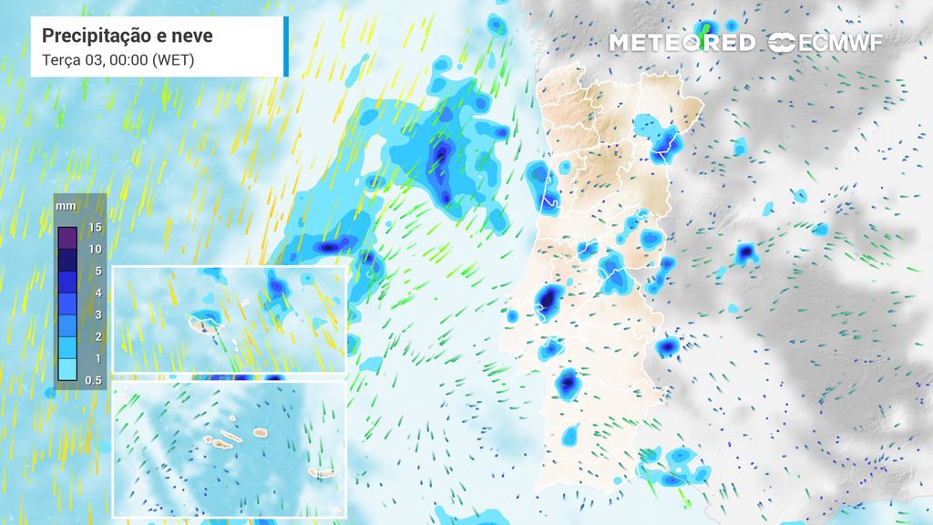 Na terça-feira, o núcleo depressionário mantém-se suficientemente próximo para continuar a gerar instabilidade, mas já mais concentrada no Algarve e Baixo Alentejo. O Centro e Norte do país deverão apresentar melhoria gradual, com diminuição da precipitação e aumento de períodos de abertas.