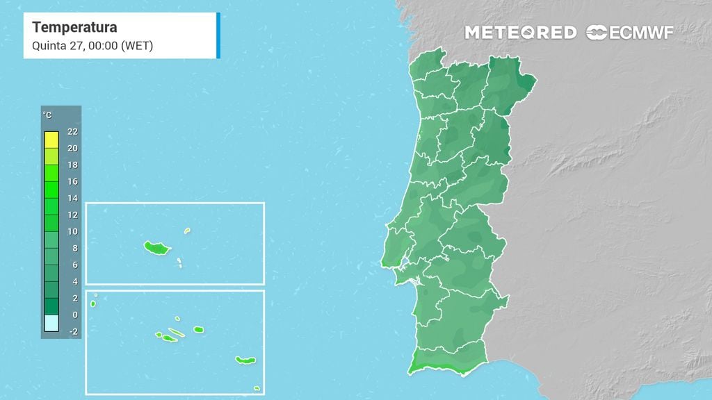 As temperaturas máximas descem ligeiramente, mas mantêm-se em valores próximos da média para o fim de novembro. As mínimas continuam baixas e, com o vento em geral fraco, persistem condições favoráveis à formação de geadas em vales interiores e áreas rurais, em particular no Interior Norte e Centro.
