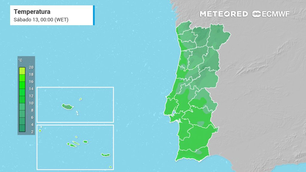 A partir de sábado (13), o afastamento da frente e a entrada de uma massa de ar mais frio e seco irão provocar um arrefecimento noturno significativo. Esta mudança de regime será visível na anomalia negativa da temperatura, com os valores mínimos a ficarem abaixo da média para esta época do ano somente na região norte de Portugal durante a manha.