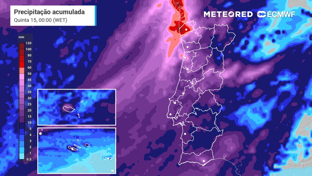 Quanto ao total de chuva acumulada o modelo Europeu prevê que até ao final de terça-feira (13) o distrito mais afetado seja Viana do Castelo, com valores entre 50 e 100 mm.
