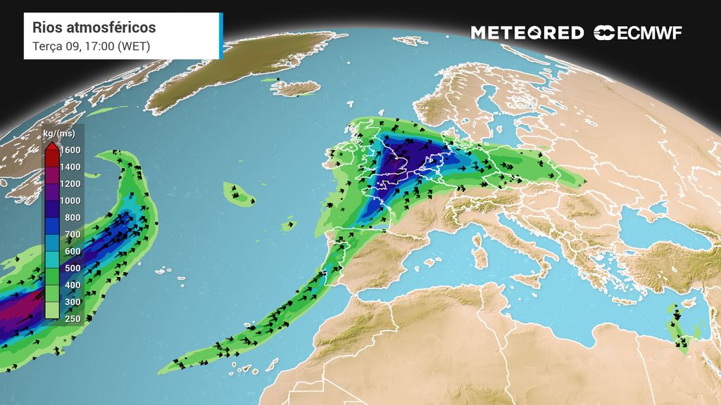 Na terça-feira (9), os efeitos do primeiro rio atmosférico atingem finalmente Portugal Continental, com chuva generalizada a partir da madrugada no Norte e Centro e expansão gradual para o Sul ao longo do dia. A precipitação será por vezes forte no Minho e Douro Litoral, moderada no Centro e mais fraca no Alentejo e Algarve.