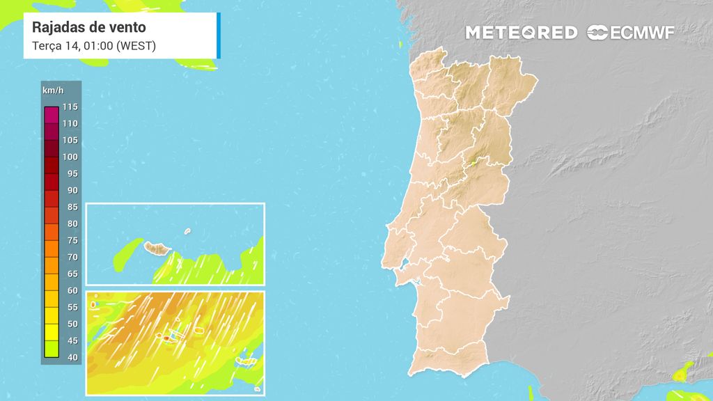 Os mapas antecipam a possibilidade do vento Norte produzir rajadas até 90 km/h, até às 06:00 da manhã de domingo, 12 de abril, no litoral e nas serras dos distritos de Viana do Castelo, Braga, Porto, Aveiro, Coimbra e Leiria, estando este mesmo cenário previsto para o litoral e serras dos distritos de Lisboa, Setúbal, Beja e Faro, mas com potencial para se prolongar até ao meio-dia do dia de amanhã.