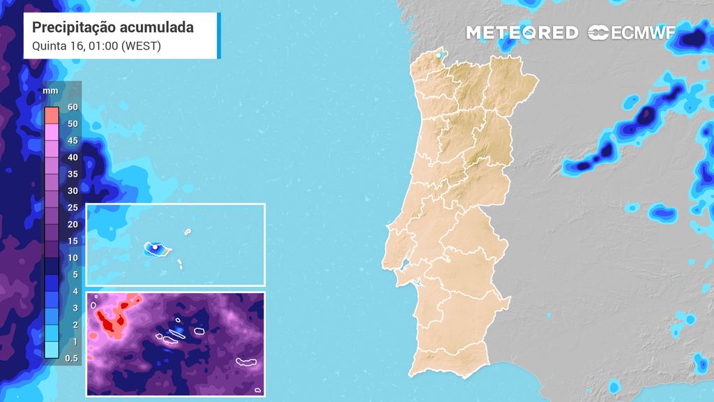 No Grupo Oriental, São Miguel poderá contar com uma acumulação próxima dos 30 mm, sendo uma das ilhas mais chuvosas deste episódio de instabilidade atmosférica. Ainda assim, é esperado que durante a madrugada de quarta-feira, dia 15 de outubro, o estado de tempo melhore substancialmente e de forma gradual.